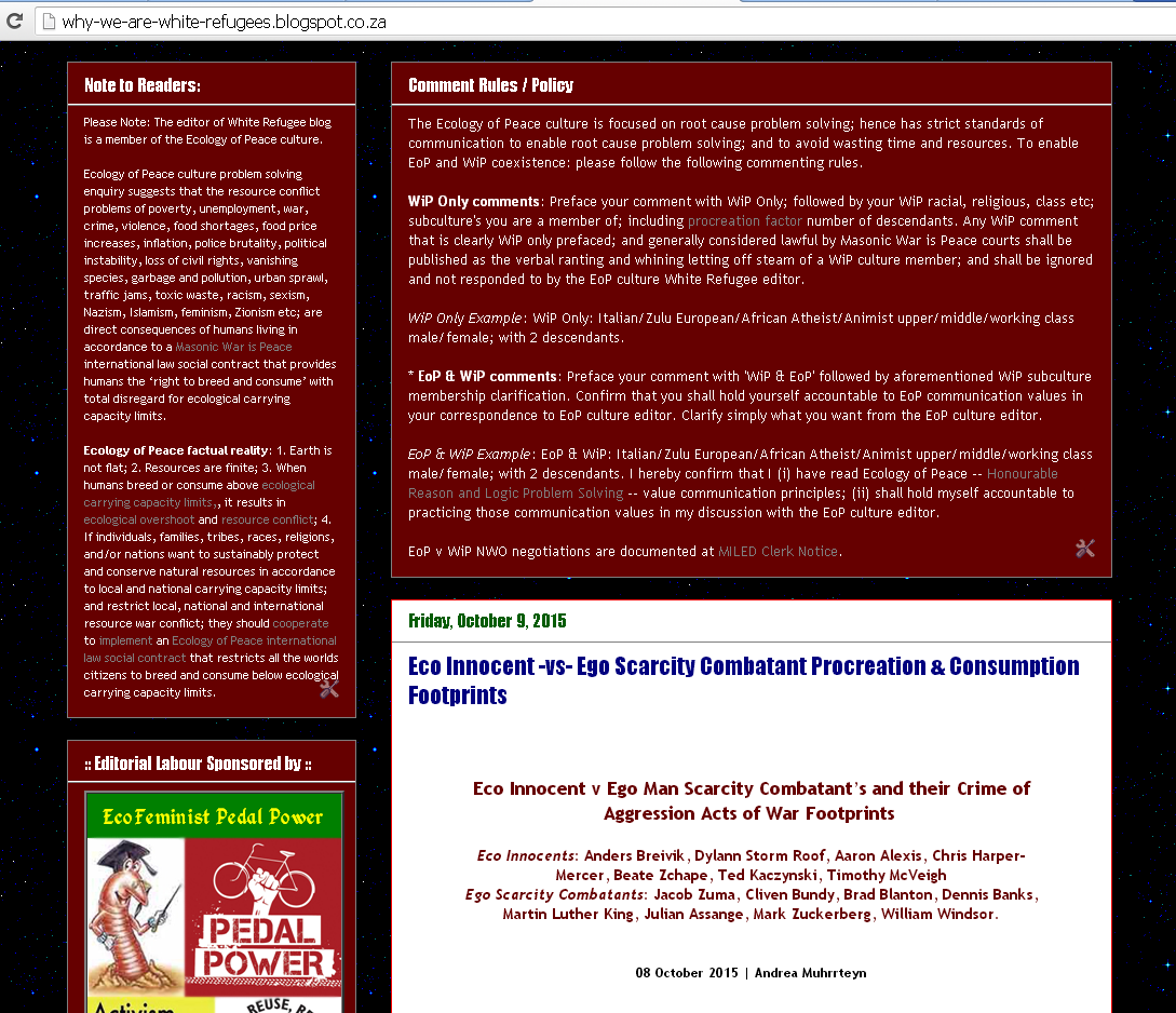On White Refugee blog see: Eco Innocent v Ego Man Scarcity Combatant’s and their Crime of Aggression Acts of War Footprints.