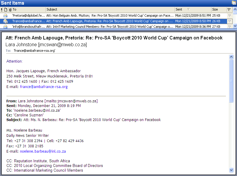 Boycott 2010 World Cup Campaign Letter (PDF) Response to IOL: Technology article, Anti-SA Smear Campaign on Facebook (PDF), by Daily News Senior Journalist, Ms. Noelene Barbeau